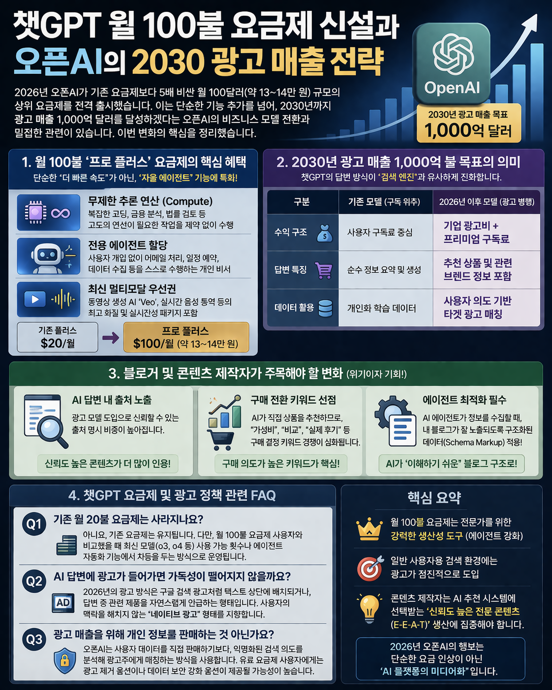 요약하자면: 챗GPT 월 100불 요금제는 생산성 극대화를 위한 '프로 도구'이며, 오픈AI 광고 매출 전략은 정보를 얻는 대가로 광고를 시청하게 되는 '검색의 미래'를 보여줍니다. 변화하는 AI 생태계에서 나에게 맞는 최적의 도구를 선택해 보세요!